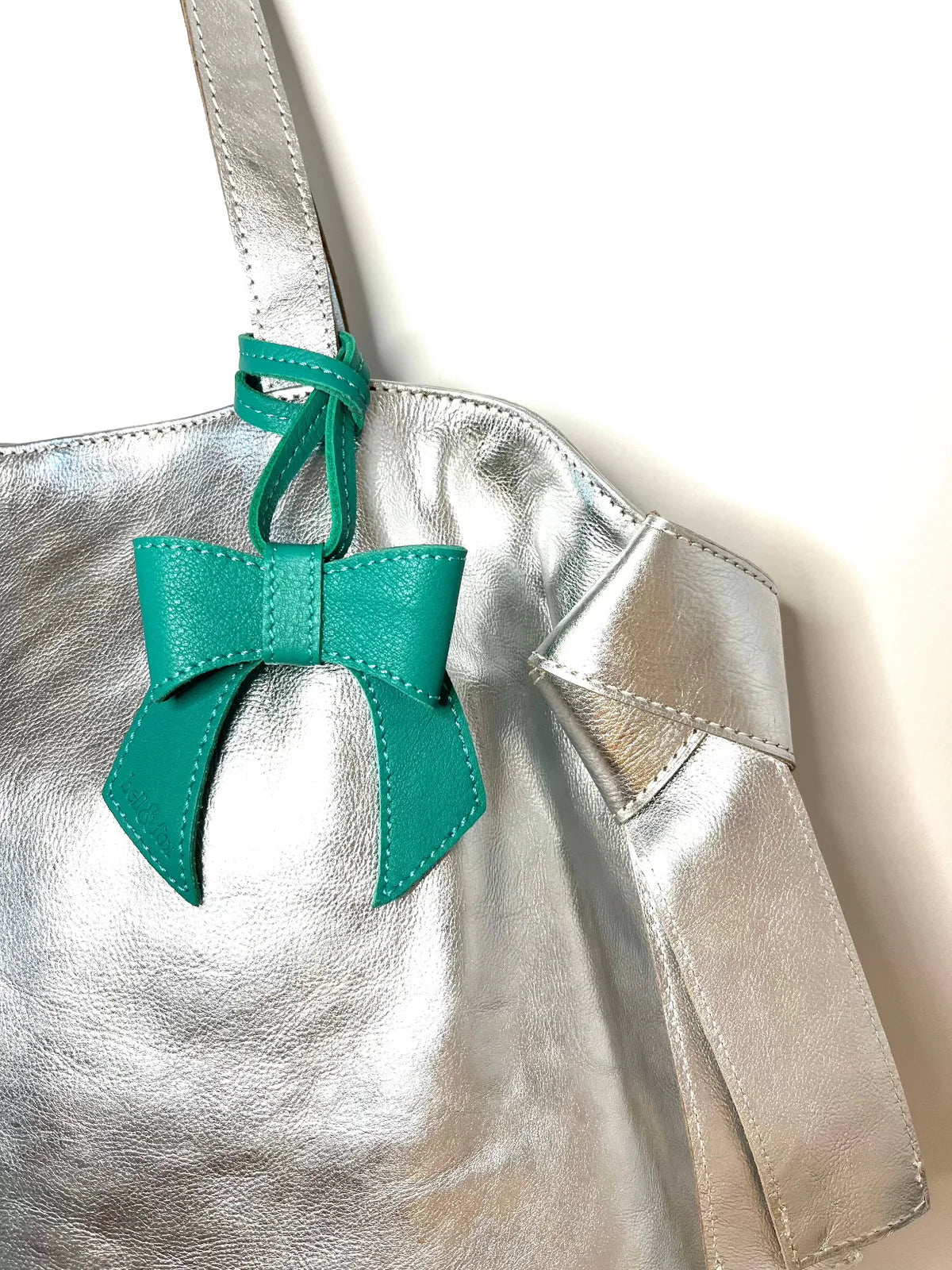 The teal leather bow can be easily looped around most handles and straps to add that touch of personality to your bag.