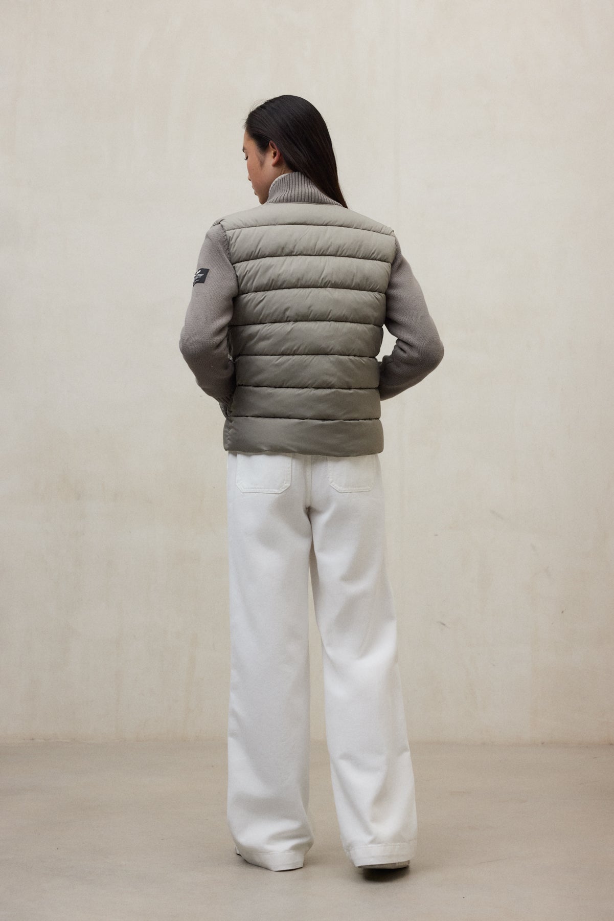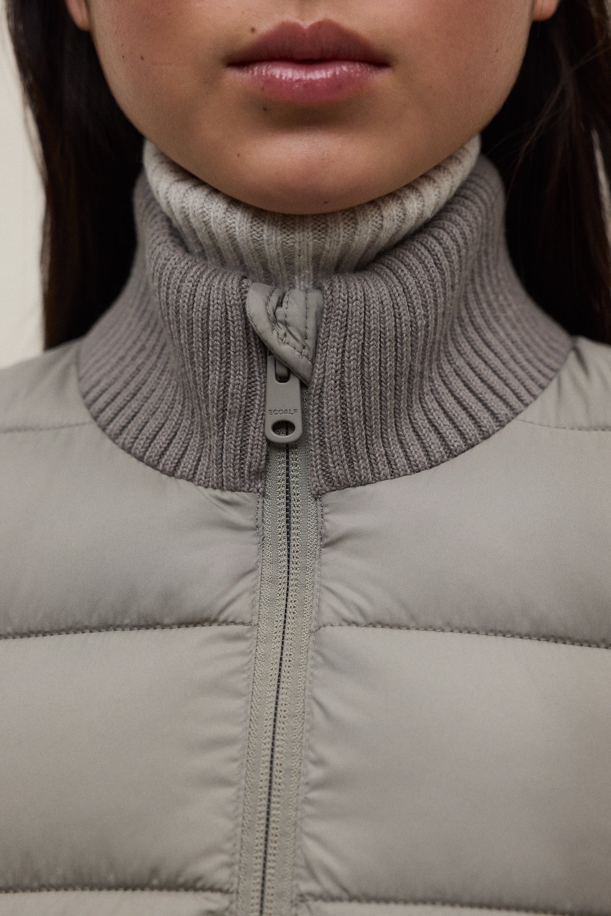 This functional jacket has a two-way zip, striking the perfect balance between the warmth of the filling on the torso and the softness of cotton on the sleeves.