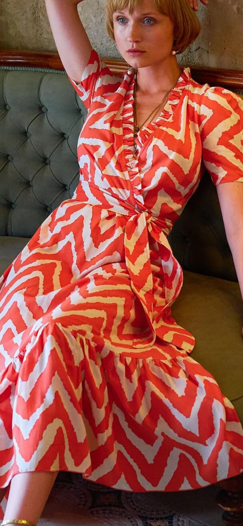 - Crossover bodice with ruffle detail – flattering and feminine.