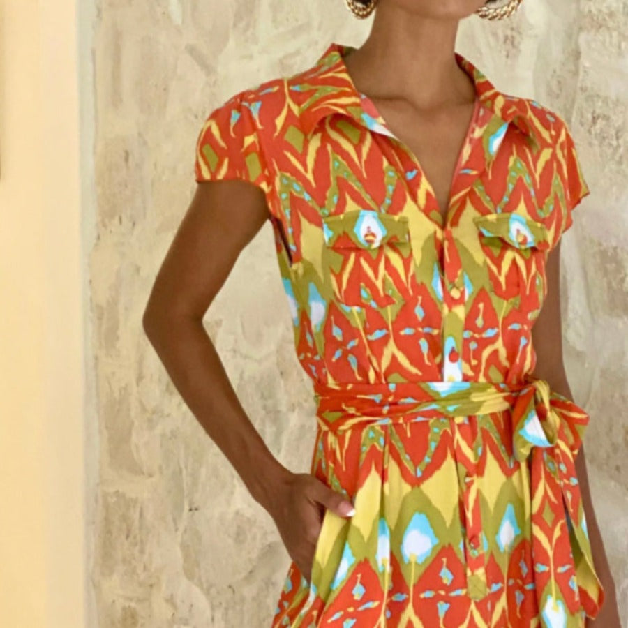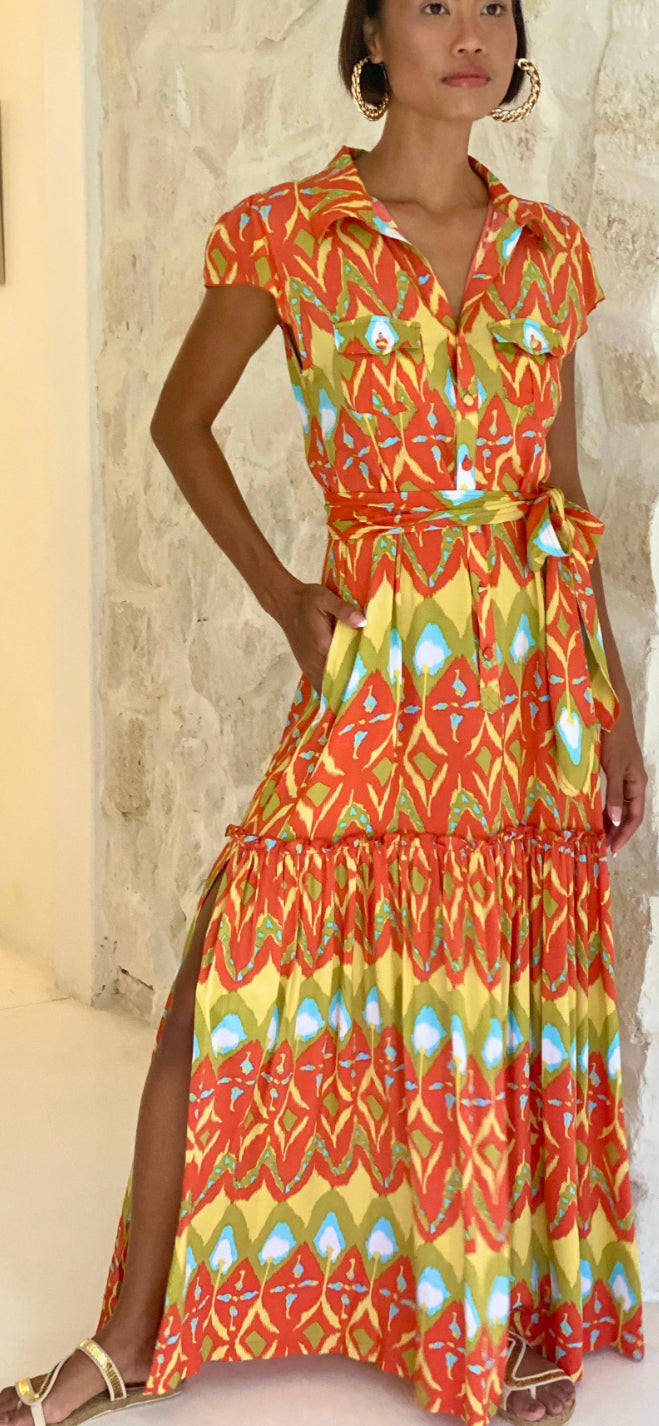 St Valentine Shirt dress is a stylish and breezy choice for daytime events or smart lunch dates. Cut with the warm tones of signature IKat DIVINE INTELLIGENCE. With ties at the waist to define the slightly loose shape. Elegant side splits on either side. Model wears size Small.