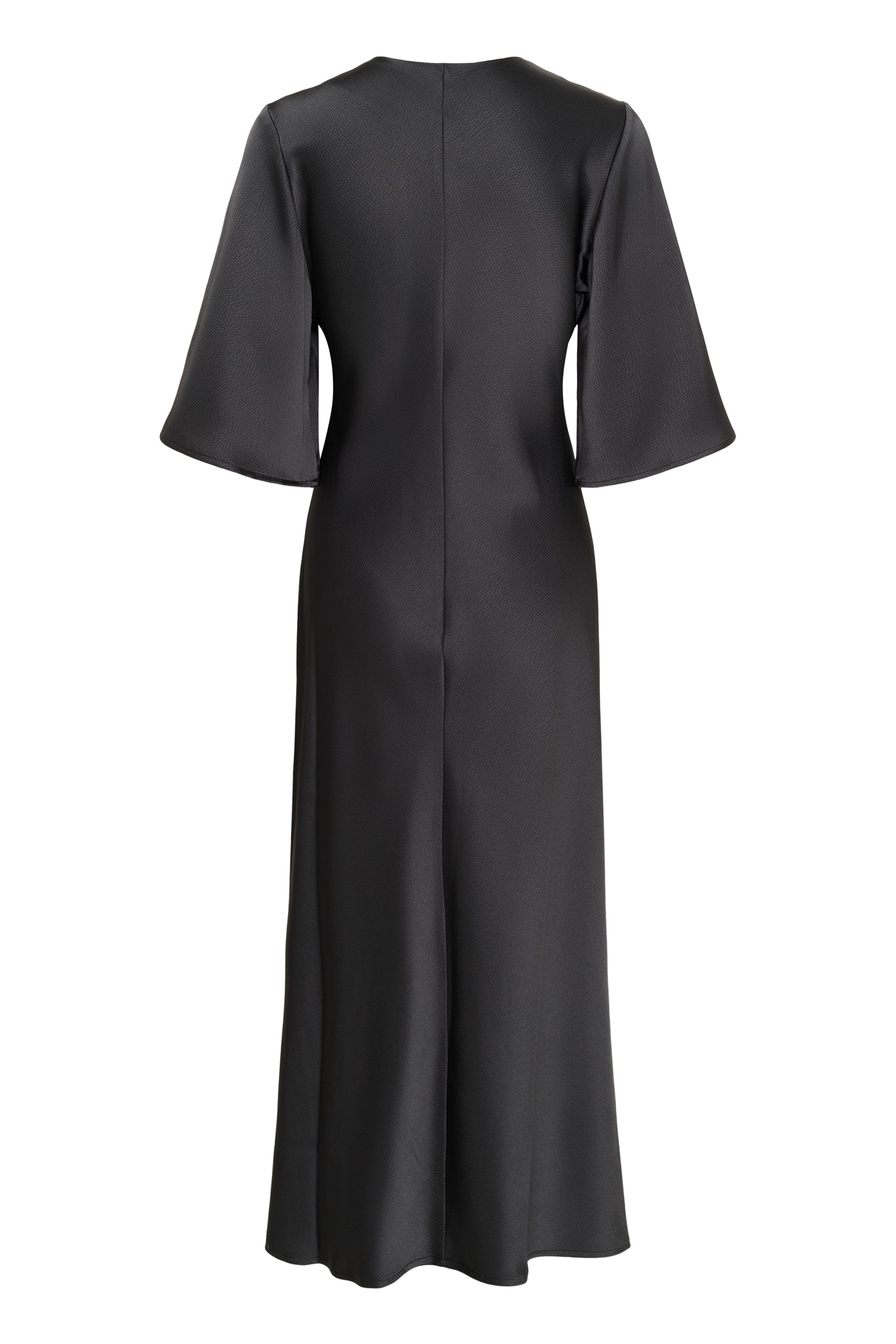 This elegant midi dress features a relaxed fit, flattering V-neckline, and softly draped 3/4 sleeves. The knotted detail at the waist enhances the silhouette, making it ideal for both formal and casual occasions.
