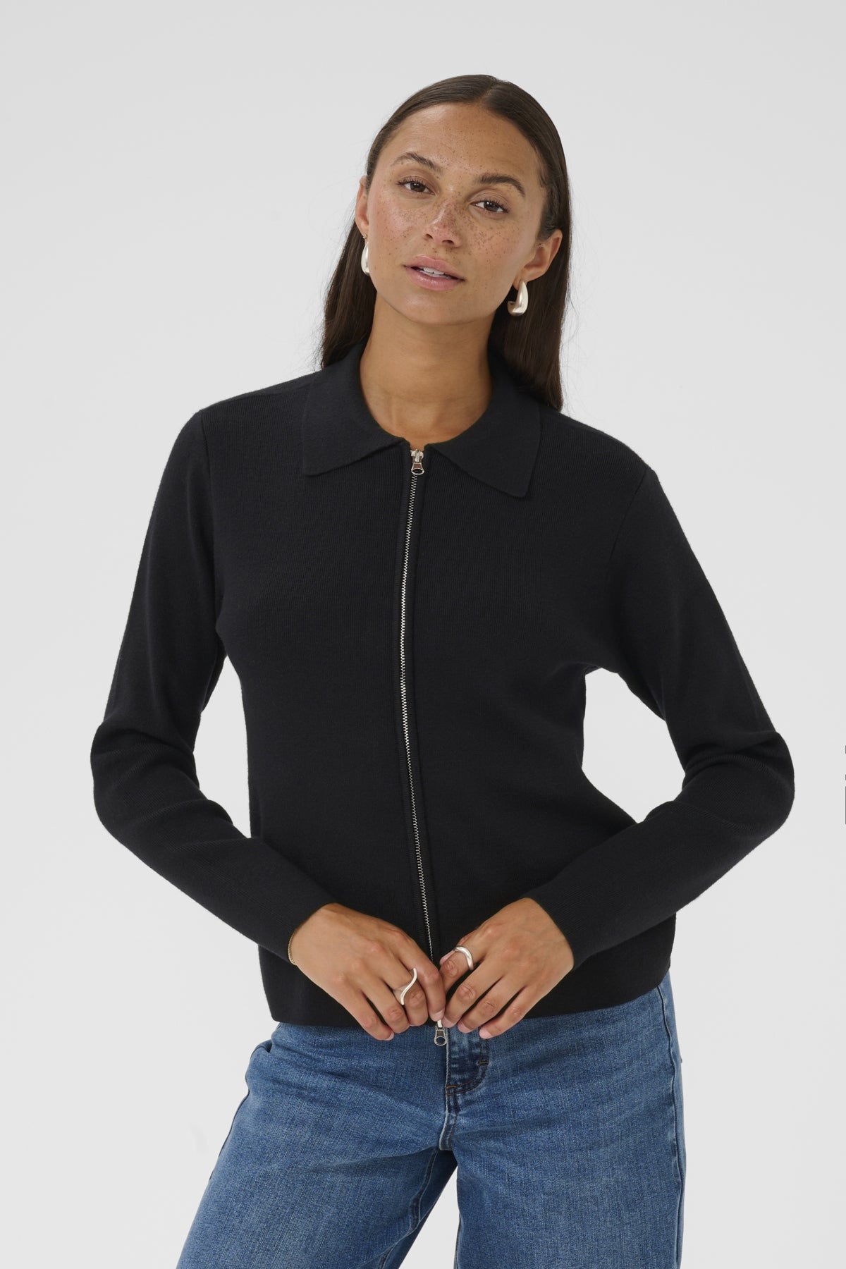 Lovely polo inspired cardigan with ribbed structure. The cardigan has a 2-way zipper and a small collar.