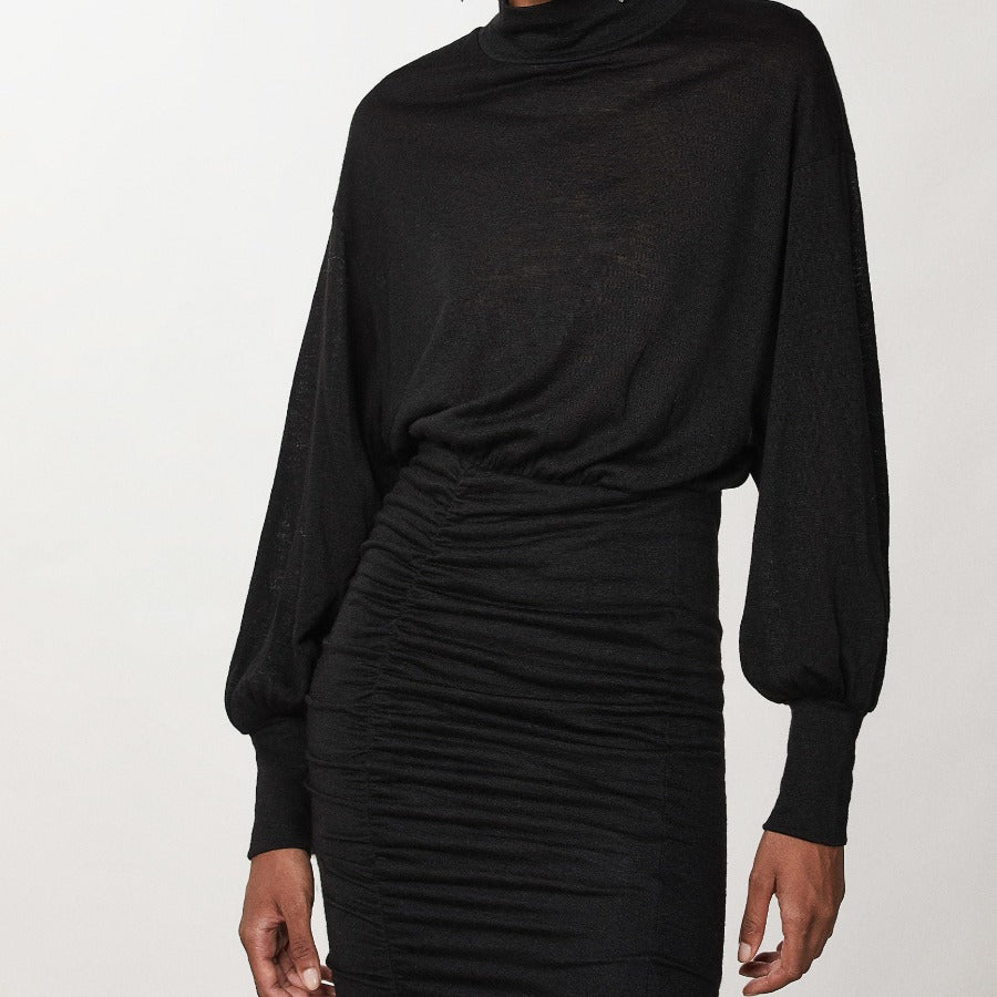 Long-sleeved wool-blend jersey dress with over fit on the top and fitted on the bottom. The skirt features an elegant central ruffle to accompany the silhouette. Tone-on-tone Patrizia Pepe print detail.
