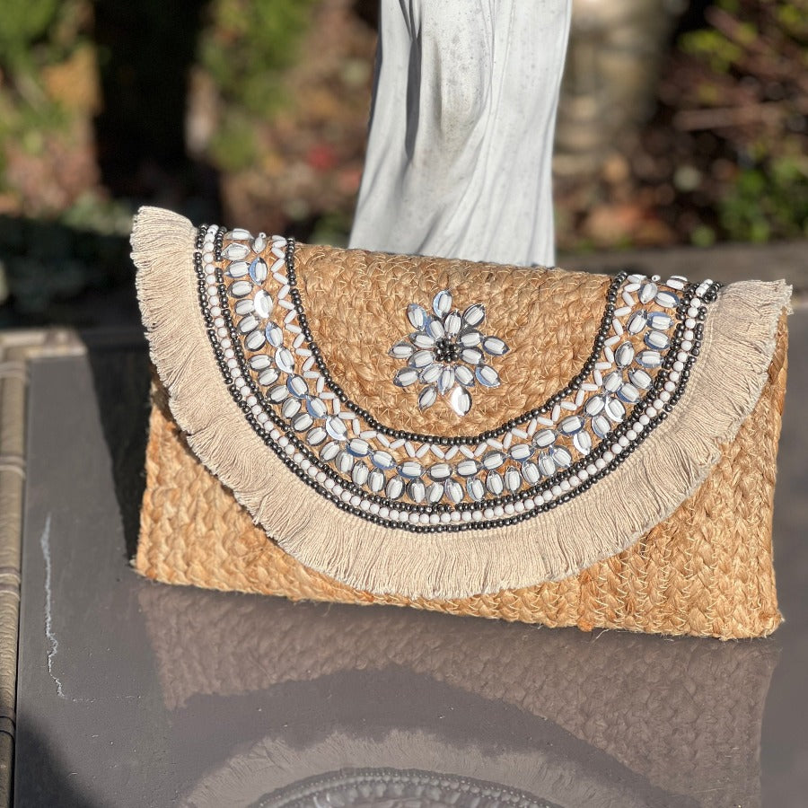 This lightweight natural raffia clutch is waiting to be unleashed in the warmer weather. All hand crafted with incredible detail. Fully lined with Cotton lining. It also features a cross body strap for the more casual look. It’s secured by a magnetic stud fastenings at the front inside to protect your belongings.