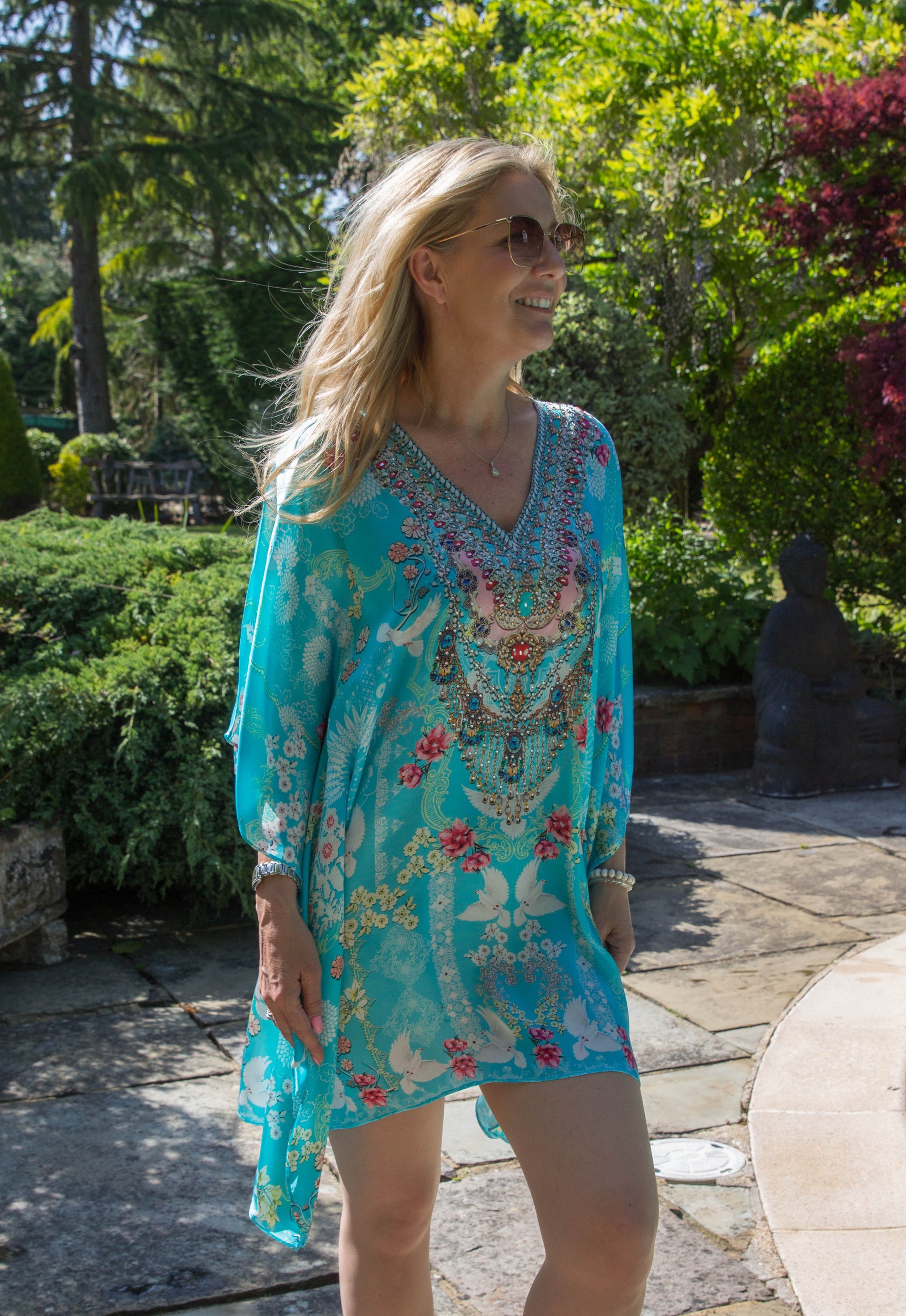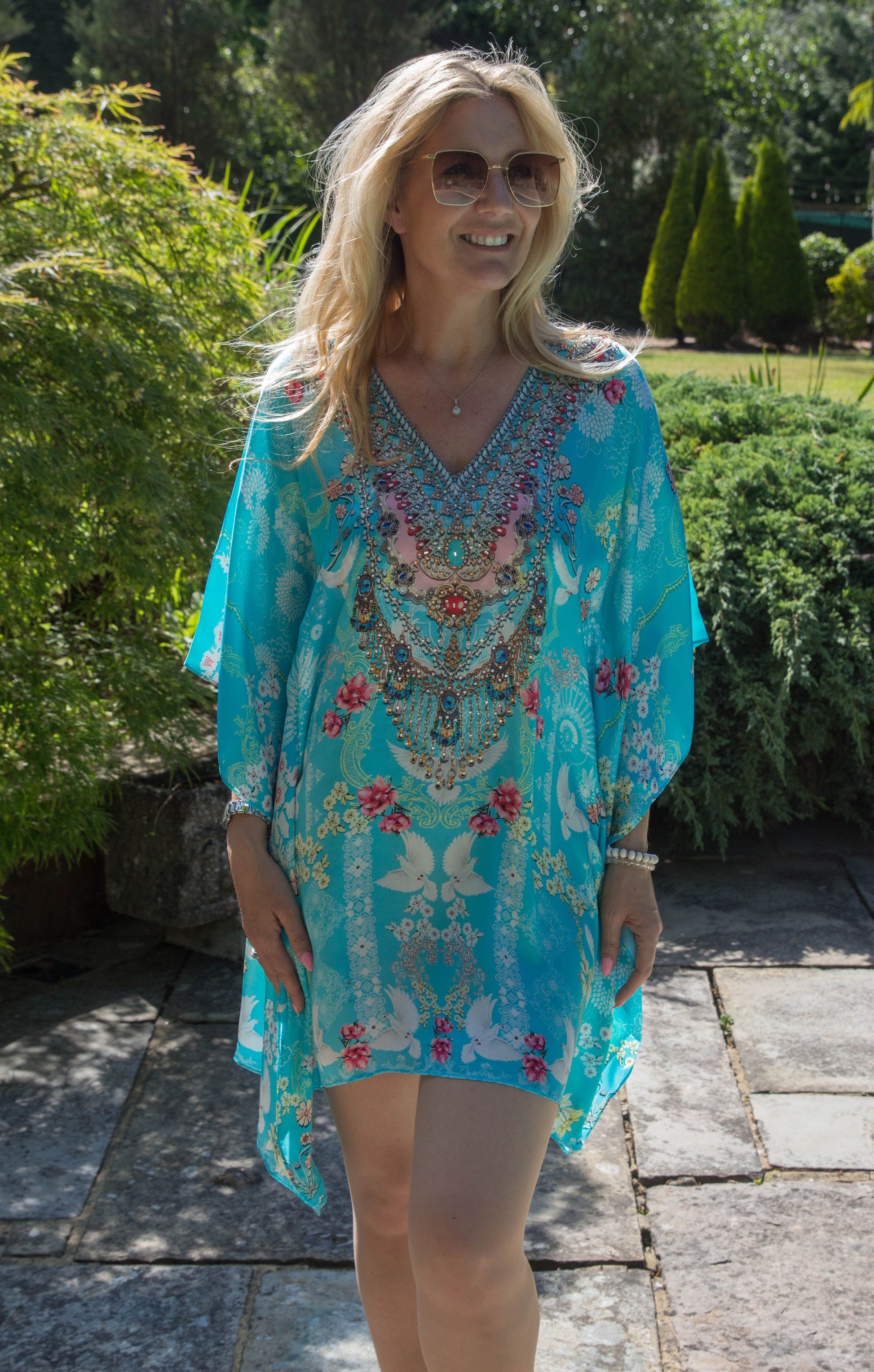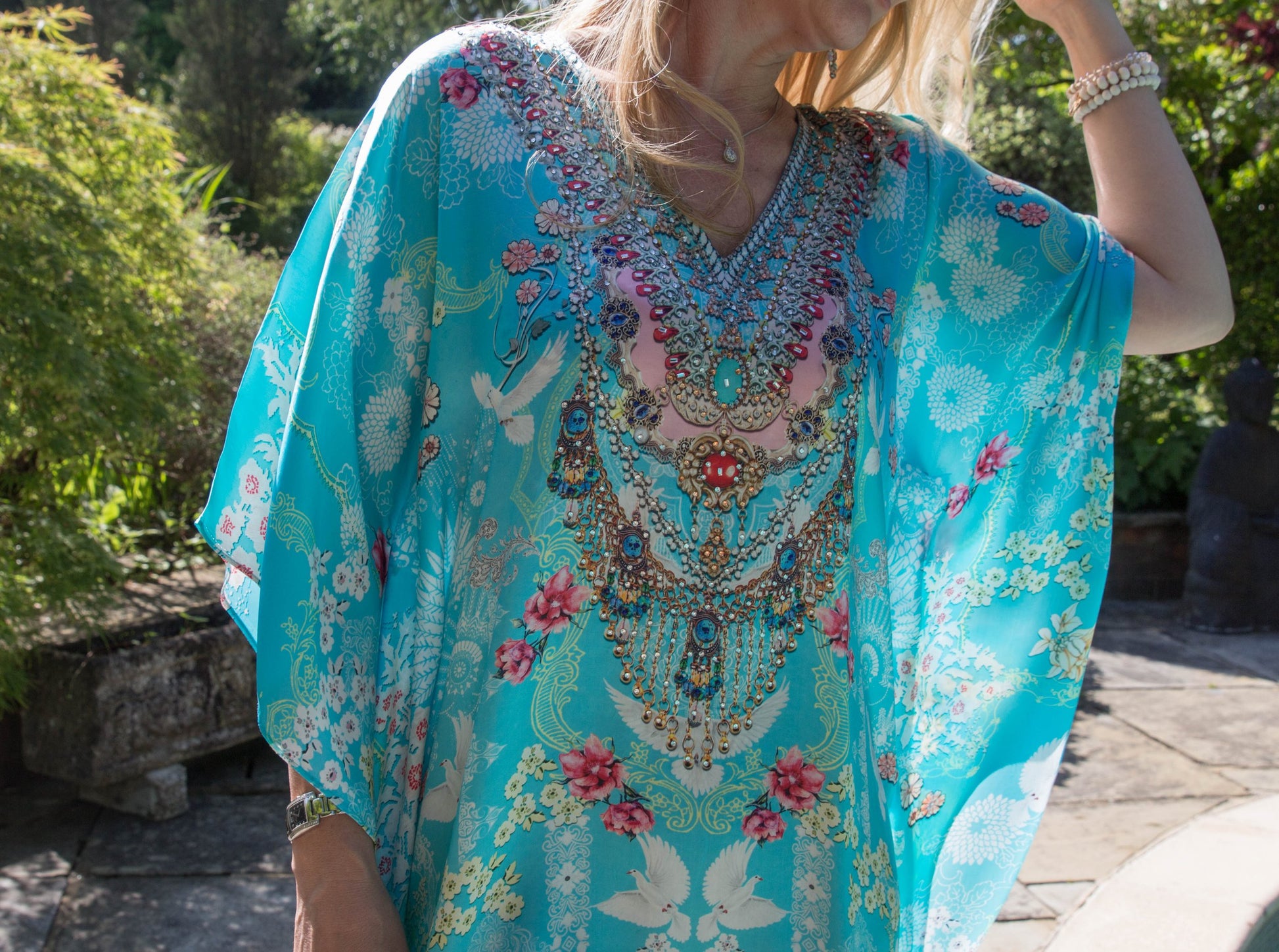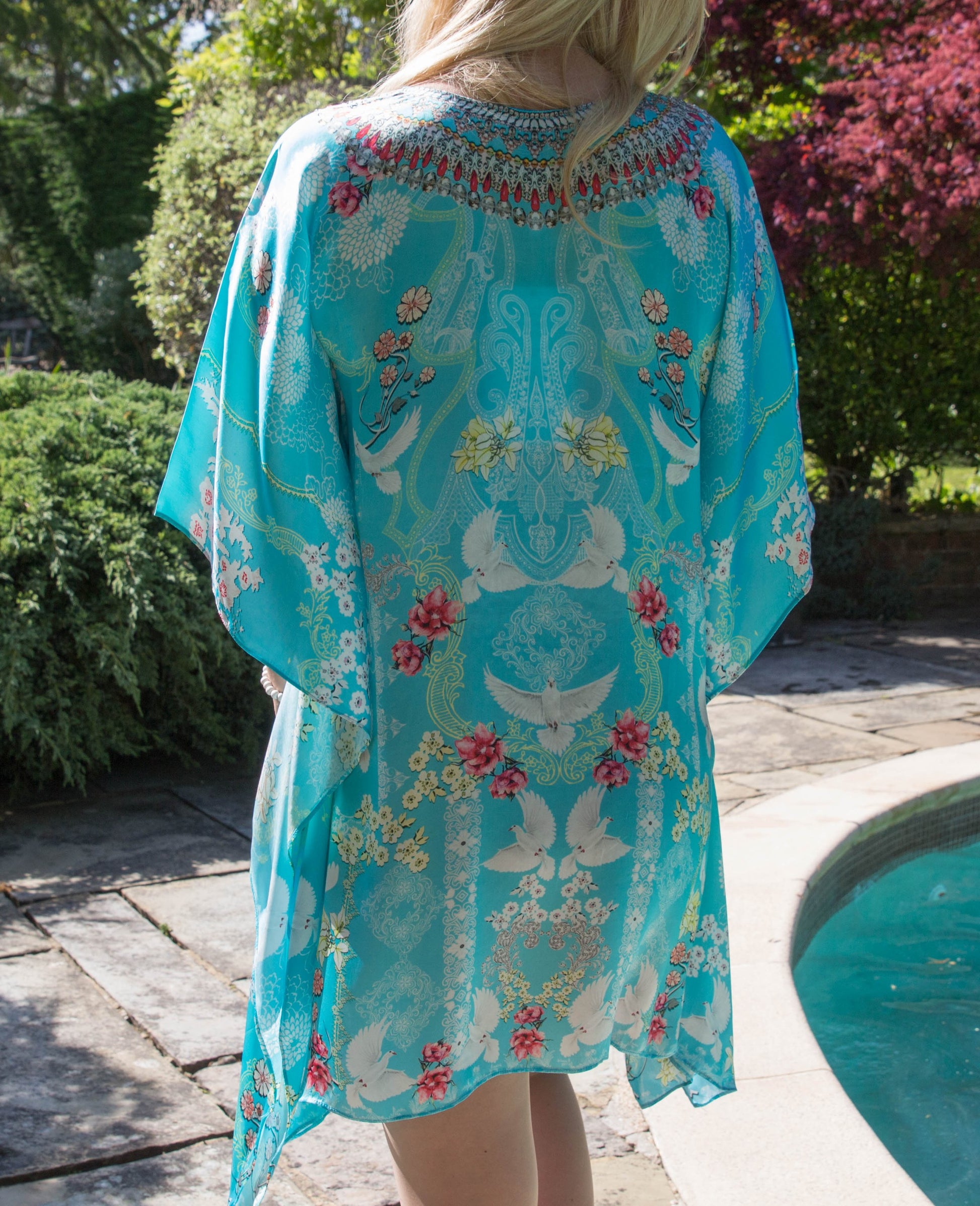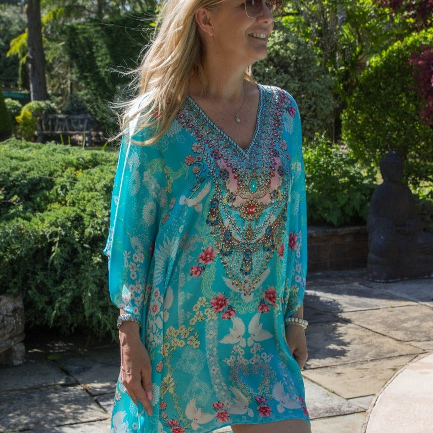 This luxury eye catching baby blue kaftan plays host to a deep v neckline adorned in hand-embellished crystals, softly draped sleeves that dance just above the wrist and a relaxed silhouette that leads into a statement shaped