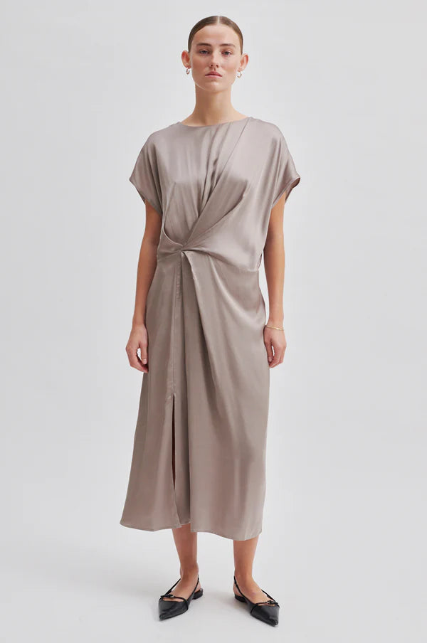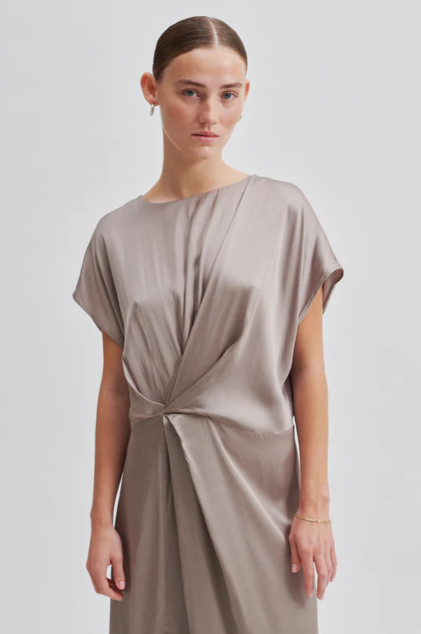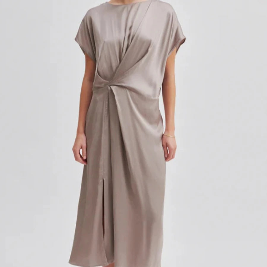 Second Female draped dress. Made in silky-soft and smooth viscose with drapy quality. Featuring a round neck and asymmetrical pleating detail at the front. Keyhole opening at the back with button and loop fastening and elasticated section that creates draped effect. Slit at one side. Regular fit that loosely skims the contours of the body.