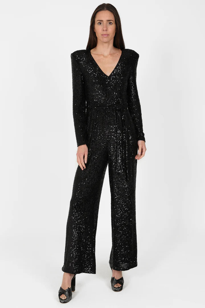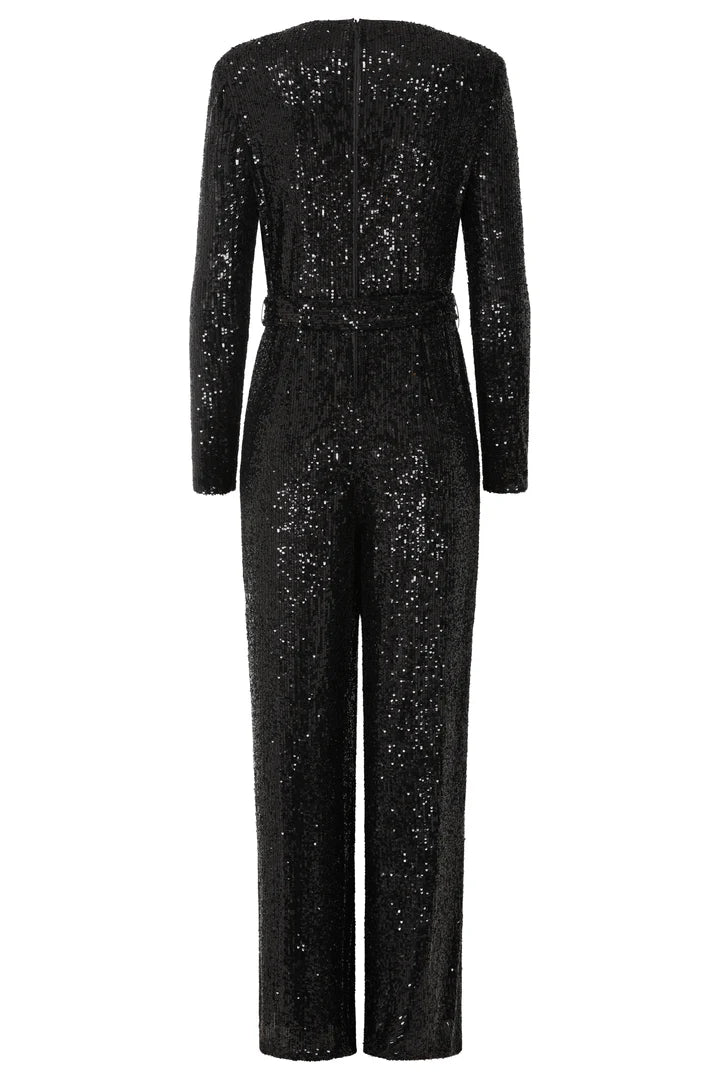 Radiate confidence in the New York Jumpsuit, designed with stretch black sequins for a chic and dazzling finish. Featuring a plunging V-neckline, structured shoulder pads, and a sequin tie belt that accentuates your waist, this eye-catching jumpsuit will have you covered this party season. Key details include: