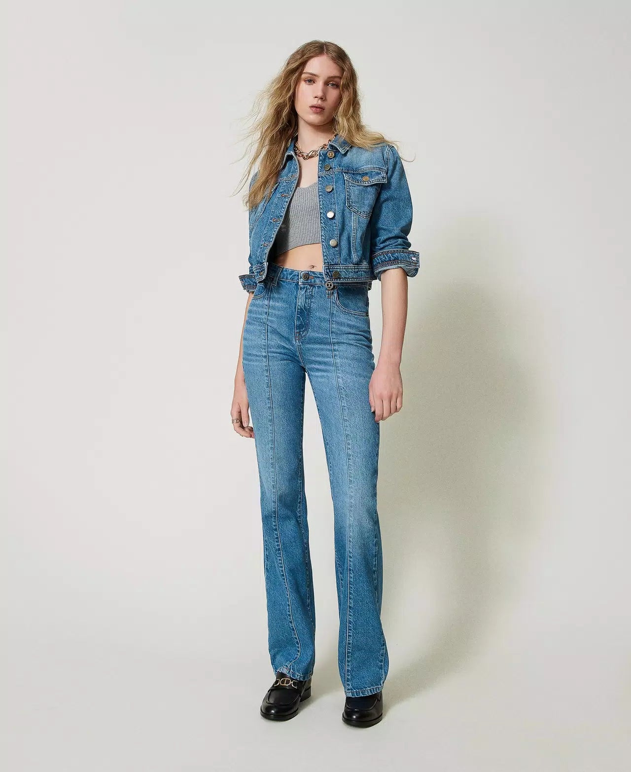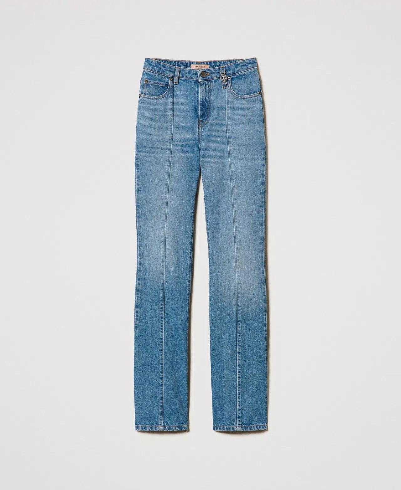 Regular waist jeans from indigo cotton denim. Vertical seams with permanent crease effect at the front, zip and logo stud button fastening, metal Oval T logo clasp, denim embroidered label with logo, light stone wash with light localised discolourations, flared fit.